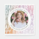 Modern contemporary födelsedagsfest för fotodekantering napkin. Med plats för foto och information. Modern rosa, pur[ppel, teal, blå, grönt, orange, gult, pastellregnbåge och vit färg kan anpassas till kostym i stil.