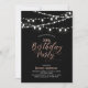 Fira en speciell dag med den chicen moderna födelsedagsfest inbjudan! Den här designen har strängen ljus och en skripttypografi i snyggt ro guld med svart bakgrund. Du kan anpassa texten till vilken ålder/milstolpe som helst. Mer vuxen födelsedag och party-tillbehör finns på min butik BaraBomDesign.