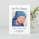 Modern hälsningskort för första julen, med ett sött pojke-tema och anpassadets blå typografiklämtning. Med en fotomall ersätter du med ditt eget baby-foto. Underbar för att meddela ditt nya tillägg den här julhelgen.