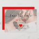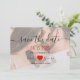 Modern kalligrafi-skript, enkel, minimalistisk inbjudan till chic bröllop spara datum med foto och rött hjärta.