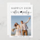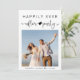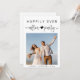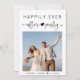 Modern bröllopsutflykt eller bröllopsannons och bröllopsinbjudan. Framsidan har ditt bröllopsdagsfoto och "Happily Ever After Party" i en blandning av enkel typografi och ett stilrent manus med hjärta och svall. Under ditt foto lägger du till dina förnamn och bröllopsdatum. På baksidan lägger du till fest- eller mottagningsdetaljer och dina namn i ett signaturliknande manus.
