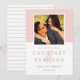 Modern bröllop spara datum-annonskort har ett fyrkantigt foto med förlovning inramat i lätt rosa/ro-petal med ett enkelt och minimalistiskt stil-monogram av brud och groom-namn med ett elegant-manusamperand. Anpassa datumtexten med datum och plats i bröllop. På baksidan av kortet finns en smal mönster av tunn dammig ro / mauve rosa och vitt vågrät rand.