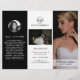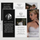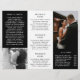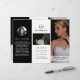 Modern fotografisk tri-fold-broschyr som visar dina favoritfoton i en elegant svart-vit design. Frampanelen har ett foto som sträcker sig ända ut till kanterna tillsammans med två textrader över ett genomskinligt band längst ner. Den yttre bakpanelen har din företagslogotyp och en textrad ovanför ett horisontellt foto och din kontaktinformation nedanför. Lägg till ditt porträtt och din biografi på panelen som kommer att vikas in i broschyren. Insidan har en bild på vänster- och högerpanelen tillsammans med en mall för information till vänster, dina paket i mitten och en à la carte-prislista på den högra panelen. Denna professionella tri-fold-broschyr är perfekt för en bröllopsfotograf.