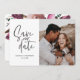 Modern fotografisk blommigt bröllop spara datum. Lila, nyp, och grönt. Modern tar över bröllop med manuskript.