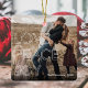 Modern dubbla sikte på jultomatprydnad med två familjefotor, det festliga talesättet "kärlek, fred, glädje" i ett modernt, vitt konturteckensnitt, ditt namn och året.