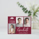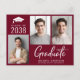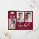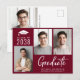 2025-studentfestens moderna burgundröda vykort med 3 foton, "Student" i ett vitt skript med fet contemporary och gradens namn, klassår och gymnasium eller högskola i enkel vit typografi. På baksidan lägger du till ytterligare ett foto och information om party.