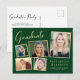 Modern grön examensfest inbjudan vykort med en 5 fotokollage av spridda bilder i guldramar, "Graduate" i ett elegant guldsnitt, examenets namn i elegant guldtypografi och deras skola och klassår i enkel guldtypografi. Anpassa dina festdetaljer på baksidan.