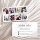affärskorten för chic och elegant för fotografer innehåller åtta av dina bästa foton i en samlingslayout, som är uppdelade efter ditt namn eller namn i modern text. Lägg till kontaktuppgifter för fullt på baksidan, inklusive användarnamn för social-media, i mjuk mörk svartvitt på en skarp vit bakgrund.