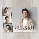 Minimal, modernt studenten-annonskort med student-fotot överlagrad med tre mindre fyrkantiga foton och "Student" namn, skolår och klassår i enkel typografi.