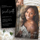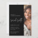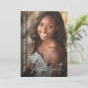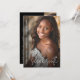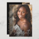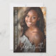 Inbjudan till studenten som innehåller ditt foto med namn i student i ett modernt, vitt skriptteckensnitt och namn och år som är anpassat till det lämnat över en mörk övertäckning. Ytterligare meddelande om inbjudan till foto och anpassningsbar på baksidan.