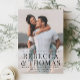 Ett modernt överlägg med stort namn och ett fullt utfallsfoto är kännetecknen för denna bröllopsinbjudan. Baksidan är en magnet. Klicka på knappen Redigera om du vill anpassa designen.