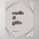 Denna moderna geometriska grå skylt för kort och presenter är perfekt för ett enkelt bröllop eller möhippa. Den klassiska designen har bohemiska geometriska diamant- och triangelformer och rustik boho-typografi med en chic modern industriell känsla. Textraden längst ner på skylten kan anpassas med datumet, brudens och brudgummens namn eller ett kort meddelande som "Tack". Denna skylt kan användas för ett bröllop eller någon annan tillställning eller fest.