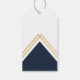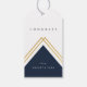 En modern presenttagg med anpassningsbart grattis-meddelande med guld och marinblå triangelelement.