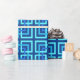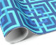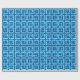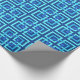 Svällning papper i ett retromodernt mönster av förreglande fyrkanter, i kobolt, himlar blå och akvarium, på en djup marin/indigoblå bakgrund