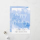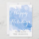 Den moderna abstraktens vattenfärgsblåa vinterkort stänk Glad helg, med ett handmålat vattenfärgsfärgat stänk med struktur i blått, träd i vitt med snö, snöflingor, texten "Glad helg" i vitt och ditt namn i grått.
