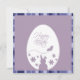 Glad påsk-illustration med ett enkelt minimalistiskt påskägg färgat med siluetter av en kanin, fjäril, blommor och påskhälsning på en rosa lila bakgrund med en randig ram.