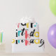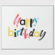 Modern, lekfull, färglös grafisk design av ett ordspråk "Grattis på födelsedagen" i rött, gult, blått och svart färg. Kreativets typografi.