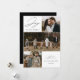 Modern julkort med frasen "Glädje till världen" i elegant svart skrivstil med vit bakgrund. Framsidan av designen visar 3 av dina favoritfamiljefoton arrangerade i en collage-liknande layout. Personalisera framsidan av det flerfotos-julkortet med ditt familjenamn och året. Kortet vänds för att visa ett extra foto.