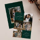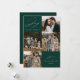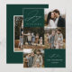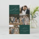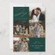 Modern julkort med frasen "Glädje till världen" i elegant vit handskrift på en grön granbakgrund. Framsidan av designen visar 4 av dina favoritfamiljefoton arrangerade i en collage-liknande layout. Personifiera framsidan på det flerfotos-julkortet med din familjs namn och året. Kortet vänds för att visa ytterligare ett foto.