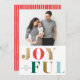 Ett modernt fotofirande vykort med omväxlande guld och festliga röda och gröna GLÄDJERIKA budskap.