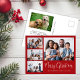 Modern röd helgdag-vykort med 4 fotokollage på framsidan, "God jul" i ett vitt skript i chicen och ditt namn och år i enkel vit typografi. På baksidan lägger du till ytterligare ett foto och ett personlig säsong-meddelande till familj och vänner.