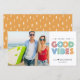 Designen har en modern färgglad "god vibration" med ditt favoritfoto. Vit julklott doodle-trädsmönster överlagd i senapsgul på baksidan av semestkortet.