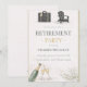 Modern gold and neutral design with champagne pour detail, travel suitcase and lounge chair accents, and soft botanical touches on a textured background. Clean serif typography balances the layout, suited for retirement party gatherings and polished evening celebrations.