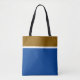 Den här eleganta chicen har en stor guldbrun överkant rand, skisserad i vitt, ovanför ett pulserande djupblått färg-block som fyller resten av designen.