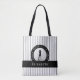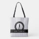 Snygg anpassningsbar shoppingväska med siluett av kvinnlig golfspelare placerad på en realistisk bild av en golfboll, infoldad av den kurviga texten ”GOLF GOLF GOLF GOLF” i skarpa vita bokstäver. Ett svart band håller ditt anpassade namn eller korta fras i elegant vit handskrift. Bakgrunden visar ett trendigt vertikalt streckmönster i ultragra och vitt. Båda sidor är anpassningsbara - lägg till ett namn på den ena och en fras som ”Live to Golf” på den andra. Gör en snygg present till golfälskare, idrottare eller tävlingsdeltagare. Färger och typsnitt kan redigeras i designverktyget. Skicka meddelande till BeachPauseDesigns med frågor eller anpassade förfrågningar.
