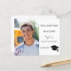 On front: Add your own vertical size photo of the graduate. A chic white background, black text. Templates for a name and date. The name is written with a modern hand lettered style script. With a cap, tassel topper.