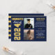 Lindo Modelo de Invitacion de Graduado con estilo de graduado de secundaria con esta invitación de graduacióncon 2 fotos e invitación de fiesta. La tarjeta "Ahora y después", de dos caras, muestra dos fotos del Graduado (una foto actual y otra más antigua de su primer día de escuela) con un diseño simple y masculino con letras inspiradas en jersey deportivo. Los colores Azul marino y dorado, hacen de esta invitacion una linda invitacion elegante para tu graduacion de Hombres o Mujeres **Consejo de fotos: recorta tus fotos en una forma cuadrada antes de subir.
