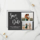 Elegant modern handskriven kalligrafi med två foto-spara datum meddelande-kort i mörk grått. Minimalistisk bröllop-design har en elegant med ett enormt kursivt, handskrivet kalligrafiskript med texten "Spara datum" och två foto med ram på mörkens grått-bakgrund färg. Mellan namn är en söt liten hjärtform. Kontakta mig om du behöver hjälp eller matchande artiklar.
