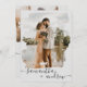 Modern minimalistisk svartvit och lätt grått-skript bröllop med 2 fotostödraster med abstrakt vattenfärgsövertäckning av fotomaskövertäckning med borstlinje.