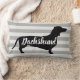 Modern svart dachshund weenie hund silhouette med vitt skript som säger "Dachshund". Bakgrunden är ett strimlat grått mönster och baksidan av kudden är svart med vitt polka dots.