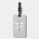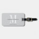 Bagagetaggen har en ren, modern utformning med en lätt grått-bakgrund och en stor, vit inledande "M" som ett centralt visuellt inslag. Framsidan har namn och jobbtiteln i en fet, centrerad layout, medan baksidan innehåller kontaktinformation och ett kort ägarskapsmeddelande. Det konsekventa teckensnittet och det minsta stil ge det ser ut som en professionell och elegant.