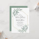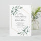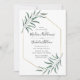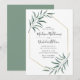 Elegant, modern bröllopsinbjudan med dina bröllop-detaljer omgivna av ett faux guld-folie geometriskt ram med vattenfärgsfärgade löv som fäster hörnen. Baksidan har en solid grönt-bakgrund. Designad att samordna med vår moderna Grey bröllop-samling.