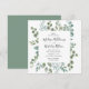 Elegant, modern bröllopsinbjudan med dina bröllop-uppgifter omgivna av en ram av grönt vattenfärga löv och löv. Baksidan har en solid grönt-bakgrund. Designad att samordna med vår moderna Grey bröllop-samling.