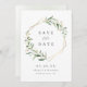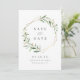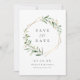 Modern grönt spara datumkortet med rustik vattenfärg botaniskt lövmyrträd och faux guld-folie löv och geometrisk ram, enkel och elegant, underbar för grönt och guld sommar rustic bröllop, vår botaniska trädgårdsbröllop. Visa alla matchande delar i samlingen