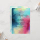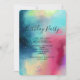 Födelsedagsinbjudan med en cool och stilren abstrakt design. Vattenfärger blandas för att skapa illusionen av en rymdbild. Grönt med inslag av lila, gult och ljust rött smälter samman med en strö av vita prickar och stjärnor. En elegant konstnärlig skapelse.