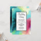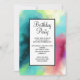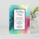 Födelsedagsfestinbjudan med en cool och stilren abstrakt design. Akvareller blandar sig för att skapa illusionen av en rymdbild. Grönt med inslag av lila, gult och ljust rött smälter samman med en strö av vita prickar och stjärnor. En elegant konstnärlig skapelse.