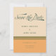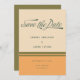Gör dina egna retro-bröllopsinbjudningar med den här bröllop spara datum-mallen som är helt anpassade i skuggor av grönt, kräm och orange. På framsidan visas "Spara datumet" i ett vintage-inspirerat återbildsteckensnitt. All text och färg kan ändras i designen av verktyg för att passa ditt bröllop-tema. Perfektens val för ett vintage bröllop, öknar bröllop eller faller bröllop.
