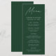 Öka din bröllopsmottagning med vår vackert utformade bröllop-meny, med ett elegant, handskrivet, vitt skript på en jägare grönt bakgrund. Perfekt för par som vill ha ett enkelt men sofistikerat utseende. Med den här moderna designen kan du anpassa dig efter namn, bröllop-datum och menyerbjudanden. Dess minimalistiska stil kompletterar utan vidare varje bröllop-tema, och tillför lite elegans till er speciella dag. Gör ett bestående intryck på dina gäster med en meny som återspeglar enkelheten i din bröllop vision av chicen.