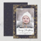 Modern blått Elegant-skript Snöflingor Bokeh Minimalistkort för Helgdag. Skicka semesterhälsningar med anpassade och personlig till vänner, kolleger och familj i enkla, minimalistiska, elegant, roligt, festliga och moderna fotokort! Ett vackert ram av olika guld vinterbakgrund snöflingor på grönten omger ditt foto. Hälsning " God jul " skrivs i elegantens kalligrafi, och i det följande visas anpassningsbarnas meddelande hälsning från din familj namn i modern typografi. Omvänd för att visa en vacker snöflingor vid guld vintern på grönt mönster.