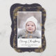 Modern blått Elegant-skript Snöflingor Bokeh Minimalistkort för Helgdag. Skicka semesterhälsningar med anpassade och personlig till vänner, kolleger och familj i enkla, minimalistiska, elegant, roligt, festliga och moderna fotokort! Ett vackert ram av olika guld vinterbakgrund snöflingor på grönten omger ditt foto. Hälsning " God jul " skrivs i elegantens kalligrafi, och i det följande visas anpassningsbarnas meddelande hälsning från din familj namn i modern typografi. Omvänd för att visa en vacker snöflingor vid guld vintern på grönt mönster.
