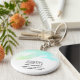 En babydusch eller födelsedag gynnar nyckelring med en abstrakt gräns längs toppen med grönt och blått snabbt färg. En mjuk och summerande design. Ett lätt korsar struktur bakom bilden.