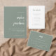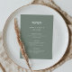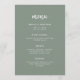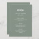 Den här eleganten har ett minimalistiskt bröllop-menykort en modern skripttypografi och ren, sans serif-text för en enkel grönt och vit design för snyggtar som du kommer att använda i kärlek.