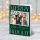 Modern helgdag-fotokort med vågräts bildkant i ett vitt snabbfoto ram. Uttrycket "Merry and Bright" visas med vit text och festive grönt bakgrund. Anpassa fotots framsida Julhälsningar med anpassningsbarna hälsning, familjen namn och året. Lägg till ditt personliga meddelande på kortets insida eller lämna det tomt om du vill skriva ditt eget. Kortets baksida visningar ytterligare ett foto och en grönt med subtila vita prickar (snö).