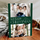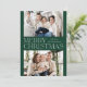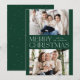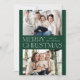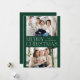 Modern julfotokort med "God jul" som visas i mitten av designen med trendig vit text med grönt bakgrund. Anpassa det enkla julkortet med dina foton från familjen namn och två vågräna. Kortet återgår till visning med gröntens bakgrund med subtila vita punkter (snö).