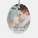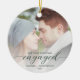 Minneshögtidlighålla din förlovning med denna vackra, moderna keepsaksprydnad. Den mörk grönt texten lyder "Vår första jul förlovad", med ord "förlovad" i kalligrafiskript för elegant med dekorativa slagord före och efter. Ersätt exempelbilden med ditt favoritfoto och lägg till namnen och året. Ett vitt övertoningsfilter hjälper till att göra så att texten visas.