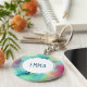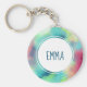 En nyckelkedja med en abstrakt coola- och snyggt-design. Vattenfärger blandas och blandas för att skapa illusionen av en rymdbild. Grönt med lila-, gult- och ljusröd blandning tillsammans med en smatning av vita punkter och stjärnor. Ett konstnärligt skapande av elegant. En vit cirkel som läggs ovanpå med ditt namn inuti.